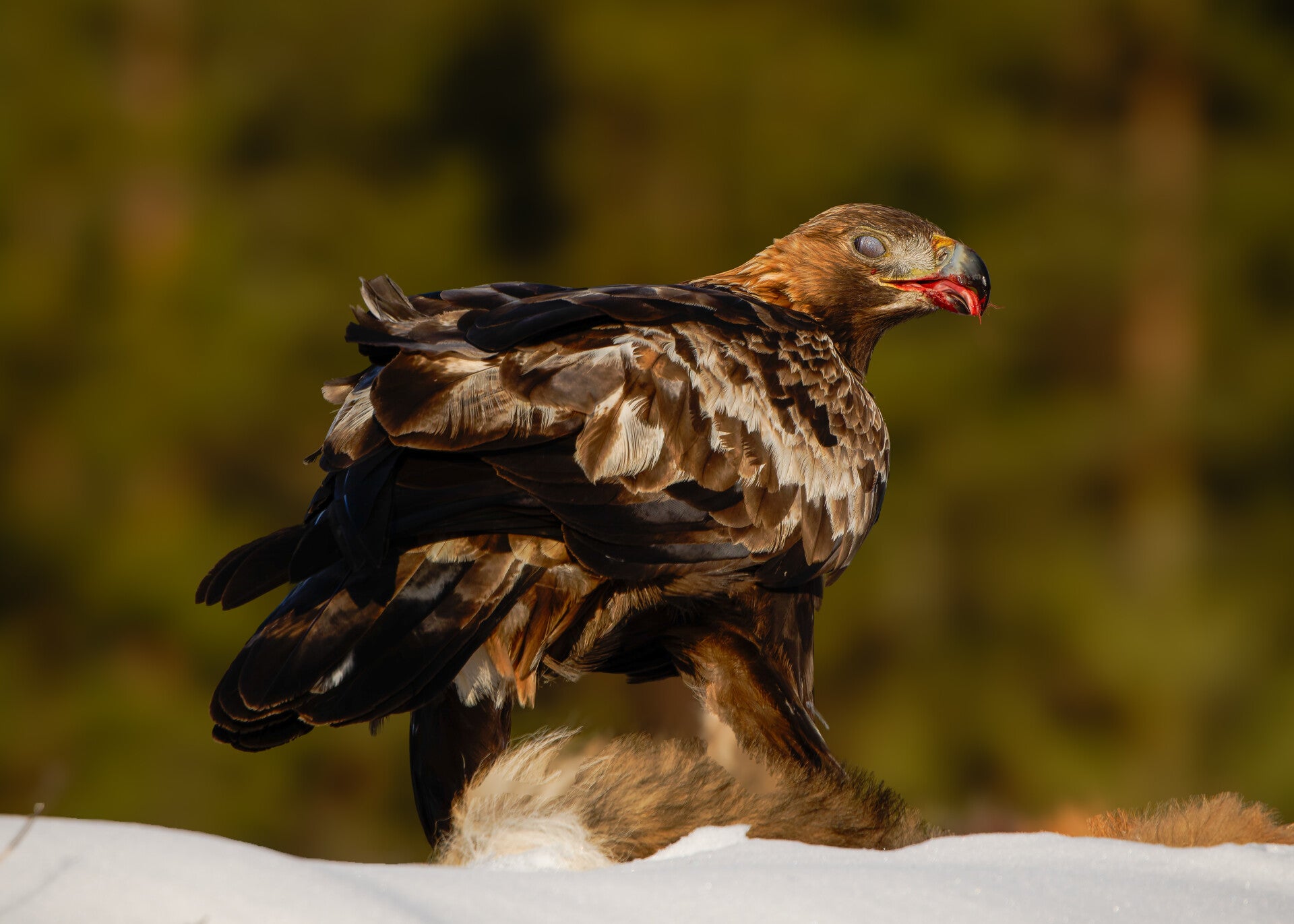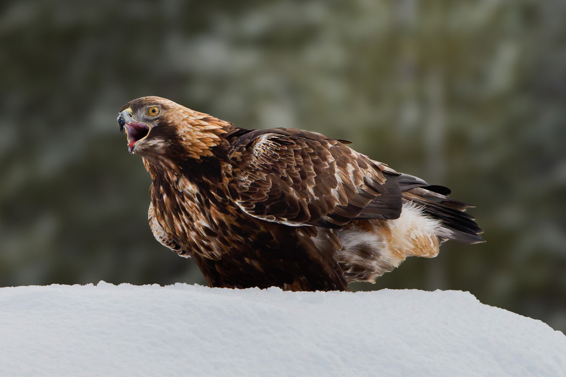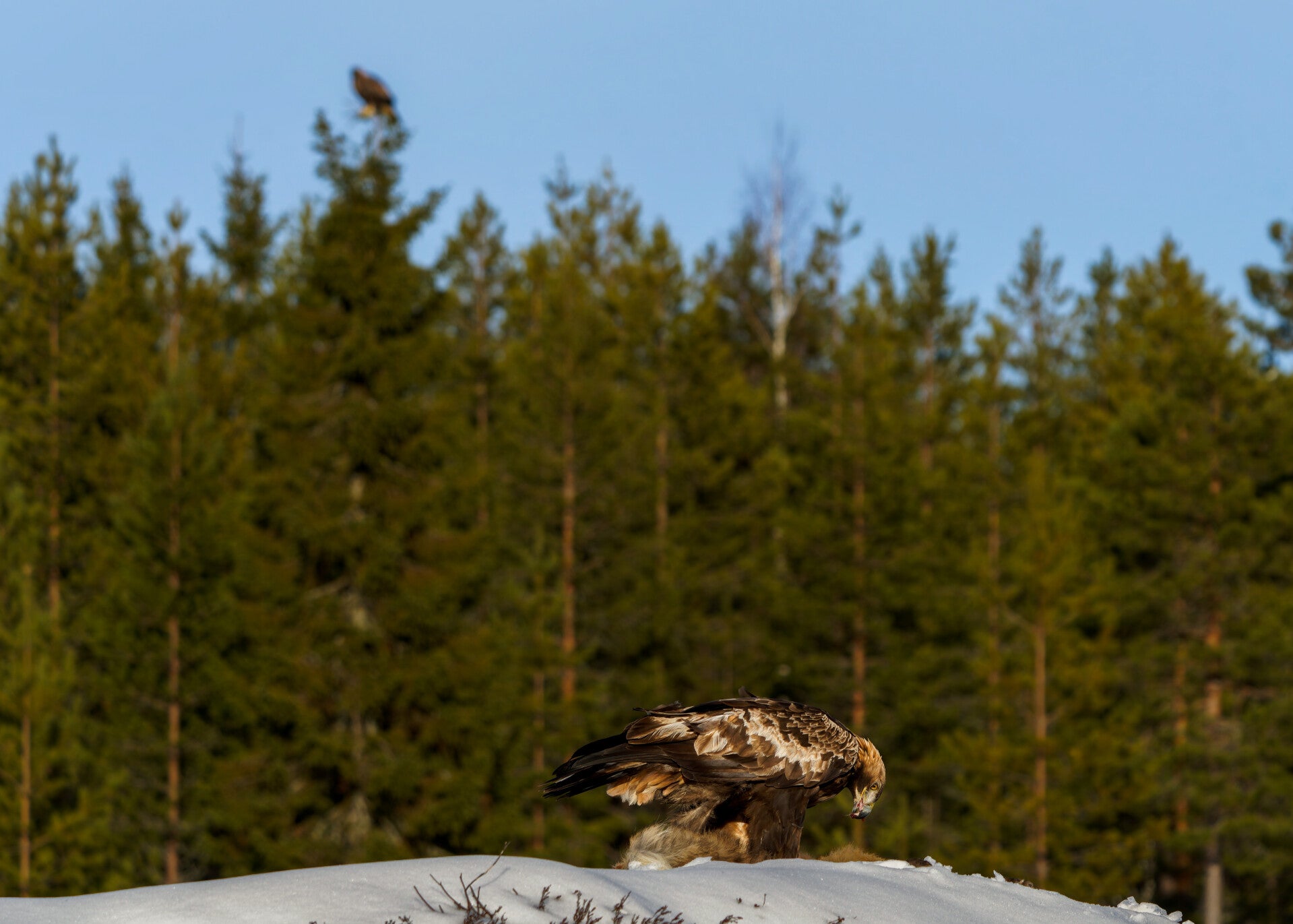 A huge bird of prey, with only the White-tailed Eagle larger in the UK. With its broad wings, it has a different outline to the smaller Buzzard. It likes to soar and glide on air currents, holding its wings in a shallow 'V'. Eagles have traditional territories and nesting places which may be used by generations. They have been illegally killed in the past and are still occasionally poisoned, or have their nests robbed. They are listed as a Schedule 1 species.